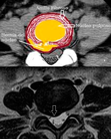 La hernia discal es una enfermedad en la que parte del disco intervertebral (núcleo pulposo) se desplaza fuera de su lugar y como consecuencia comprime la médula espinal o alguna raíz y produce dolor, entonces es cuando puede hablarse de auténtica hernia discal.